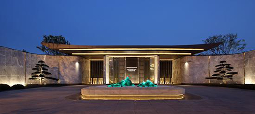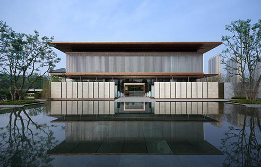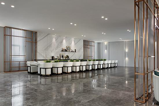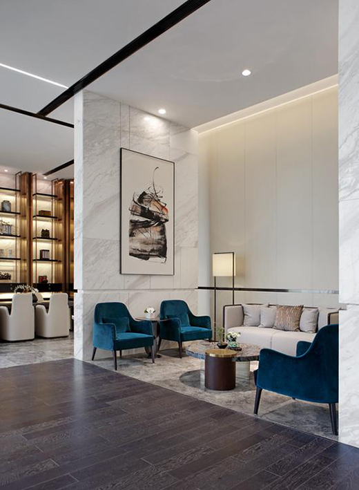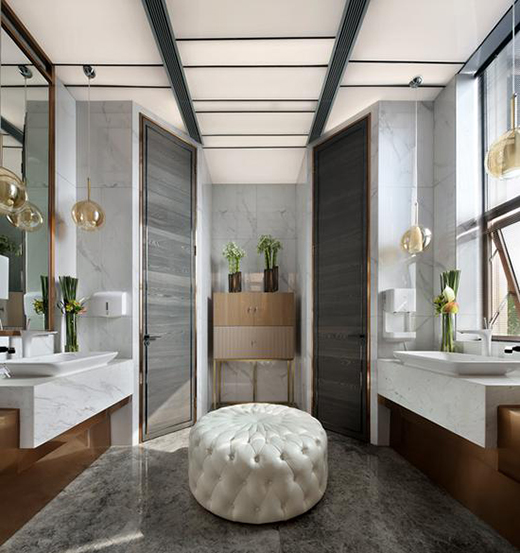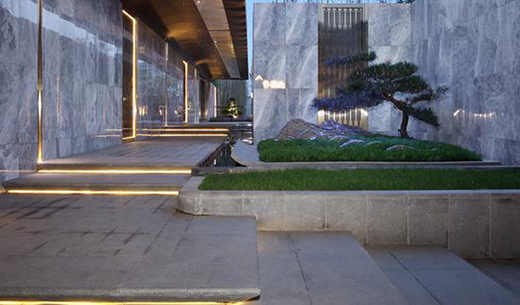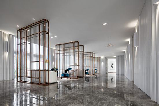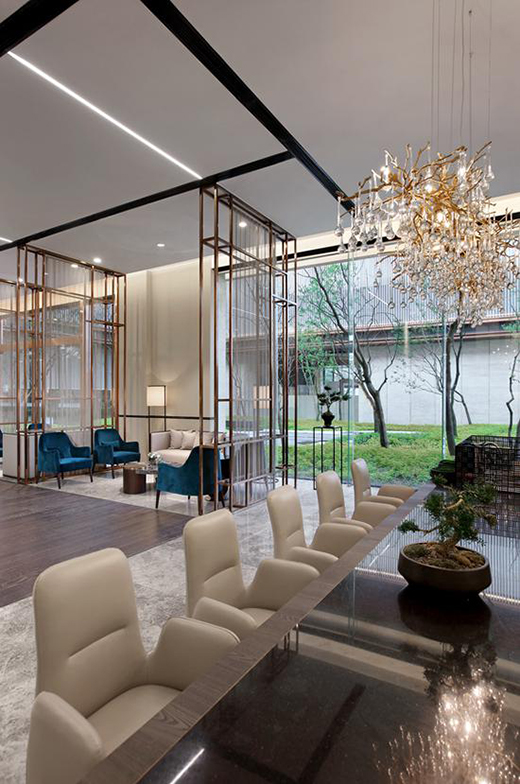 本案設計手法將東方美學融入西方設計,實現(xiàn)空間的創(chuàng)意與人文美學的表達。自東方美學中提煉出水、墨、格柵等元素,水墨渲染的大氣和簡約留白的淡然處理手法,以格柵、線條建構維持了空間內通透,水則溝通了室內外的自然與開敞的氛圍,隨光影與線條的變化,引導建筑內的空間轉換與豐富的視覺層次,突出自然健康與文化特質。
