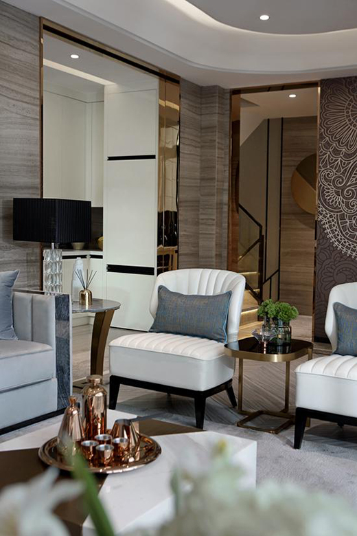 融入浪漫人文與簡約典雅的元素,優(yōu)雅地表達和升華了大都會摩登時尚和多元融合的氣質,同時加以精致的工藝細節(jié)來演繹,成就一種充盈的浪漫。整體空間設計中,以沖淡的精致,迭加深厚的底蘊,貫穿其中的是金色線條,在多與少,深與淺,簡約和創(chuàng)新之間輕柔踱步。家具與軟裝配飾摒棄繁復,木作與金屬互為搭配,洗練的線條,纖巧精美的樣式,空間中流淌著洗練的情調和舒適生活的氣息,將生活形態(tài)和美學意識轉化成可感知的設計語言。創(chuàng)造出不流于平庸、優(yōu)雅靜謐的美學空間。