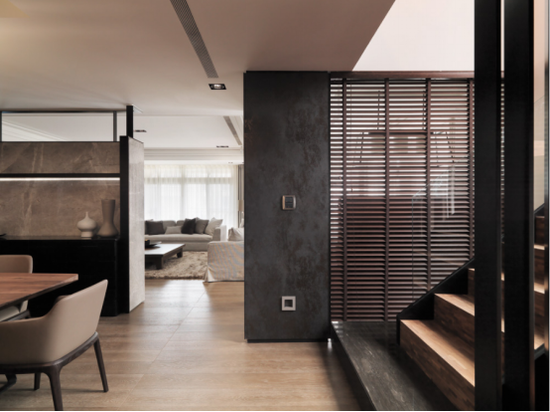 在《光影|經(jīng)過》這個作品中,唐忠漢將光影隨著季節(jié)遷化呈現(xiàn)著不斷變化的面貌,通過空間設計表現(xiàn)了出來。順應著樓梯與建筑開窗,重覆有序的垂直元素,利用突破尺度限制的格柵設計,變化陣列;調(diào)節(jié)自然的光線,可以從不同的面向穿透室內(nèi)。