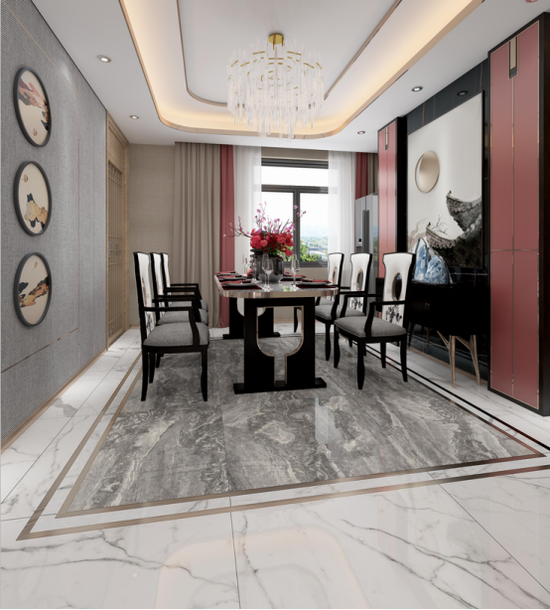 新中式風格,多以木質(zhì)材料的家具居多,在裝飾上則以山水字畫為主。在歐神諾的新中式餐廳案例中,保留了山水字畫、古色古香的木質(zhì)桌椅等經(jīng)典元素,在地磚上,也選擇了仿經(jīng)典天然石材紋理的海浪灰,凸顯傳統(tǒng)中式的特色,就連天花的吊頂燈源,也特意選擇了柔和的暖色系光源。