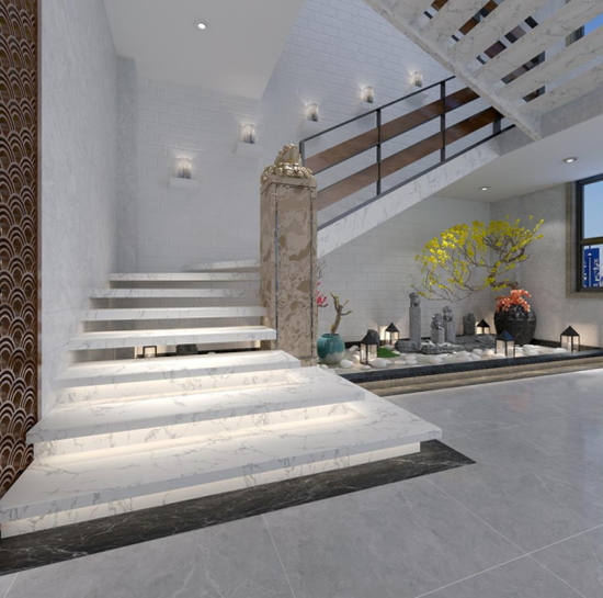 在許多空間案例中,設計師喜歡通過使用天然石材來彰顯空間的原生態(tài)。歐神諾山河白瓷磚,擁有著天然石材的原生肌理,無論色澤抑或紋理,都媲美天然石材。在歐神諾的中式樓梯案例中,就大量使用了山河白,原生態(tài)質(zhì)感盡顯其中,也增添了空間的輕快感。
