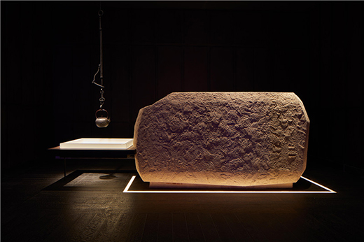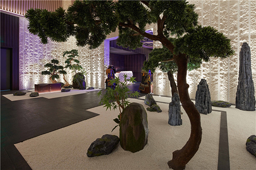 進而為凸顯質(zhì)樸的自然屬性,接待處以天然石作為接待臺,在日本古代的平民客廳中,以『圍爐里』為主光源,燃燒不熄, 故有生生不息之意。