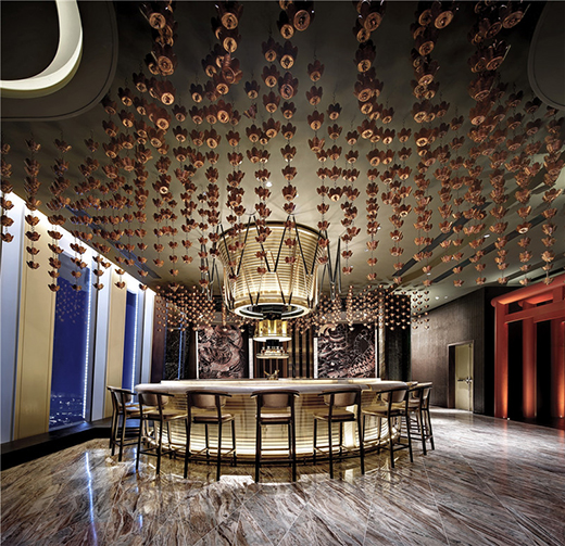 燈飾以日本劍組成,由兩把形成一組,不由想起自由、靈巧且無規(guī)律的日本劍術(shù),將其置于此,似是酒過三巡,兩三知己一較高低的引申,一幅惟妙惟肖的畫面便浮于眼前。