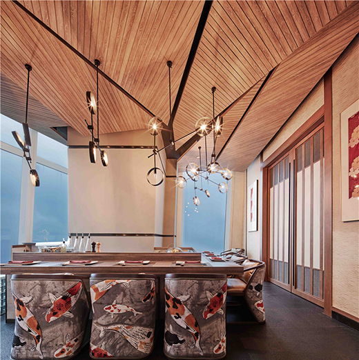 每到一處,都可體察設(shè)計師的用心之處,比如,天花模仿日本札米袋的橫草造型,而壽司臺上方米粒形狀的燈,就仿佛米在奮力沖破米袋,一粒一粒從天上地散落下來,變成一碟又一碟的美味,值得一提的是,這也是設(shè)計師為餐廳獨家設(shè)計。