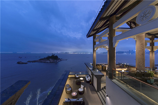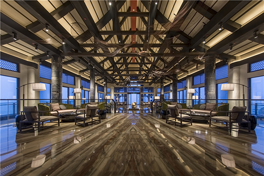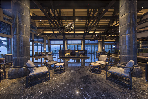 一對銅制的鳳凰飛舞在酒店大堂空中。設(shè)計師用紅銅打造風,用青銅制成凰,在偌大的空間上無聲上演一出琴瑟調(diào)和的鳳求凰。電影的鏡頭回落到窗外的大海,便能發(fā)現(xiàn)靜立在大堂中央的黃石。在珠海情侶路的海邊上,這種黃石甚是常見,在海浪不斷沖刷之下底部會生成或深或淺的青苔。