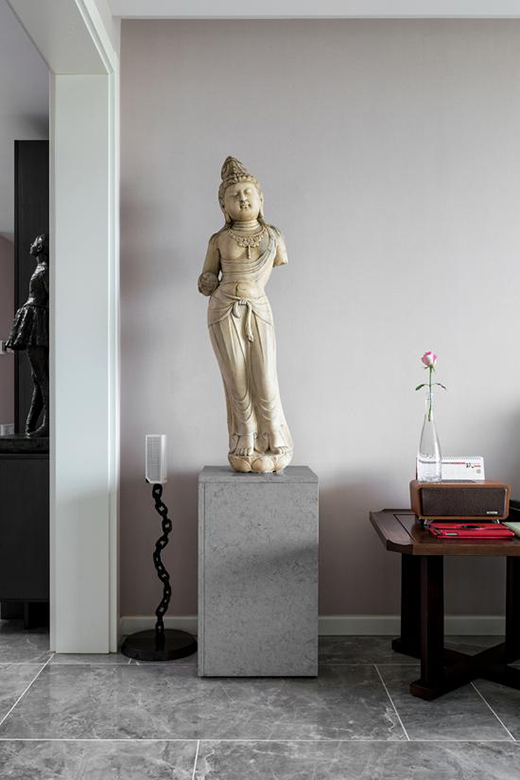 家中各種雕像、佛像和書(shū)法掛飾成為連接中國(guó)古代美與現(xiàn)代簡(jiǎn)約美的一個(gè)橋梁,將每個(gè)空間無(wú)縫柔和地連接了起來(lái),不僅凸顯出了設(shè)計(jì)師對(duì)細(xì)節(jié)的嚴(yán)格把控,更體現(xiàn)出房主的文化底蘊(yùn)。
