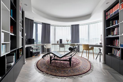 設(shè)計(jì)師以觀景屋作為書(shū)房,雖是異形空間,但是通過(guò)圓形和弧線的吊頂處理,同時(shí)巧妙地在環(huán)形落地窗下放置八卦形長(zhǎng)桌,既為讀書(shū)提供絕佳的自然光源,又給書(shū)房里的讀書(shū)人提供了遠(yuǎn)眺休憩的機(jī)會(huì)。在夏季開(kāi)半扇窗,微風(fēng)吹拂,快意盡在不言中。
