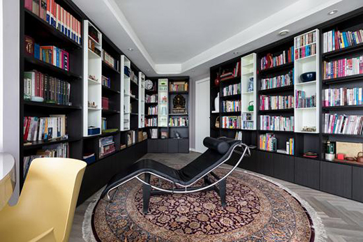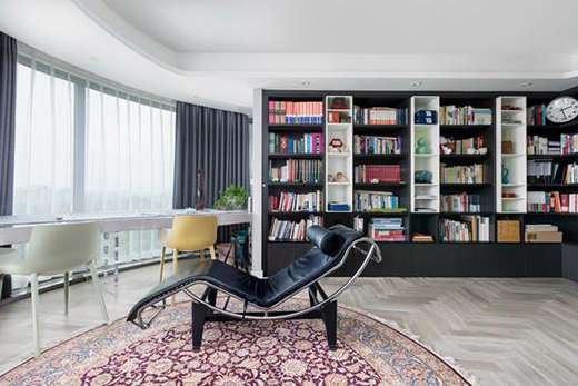 進(jìn)入書(shū)房,文學(xué)的桃花源忽地一五一十展現(xiàn)在眼前,室內(nèi)兩側(cè)的書(shū)墻黑白相間,書(shū)錯(cuò)落有序地在其間擺放,不禁讓人驚奇贊嘆。