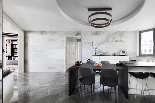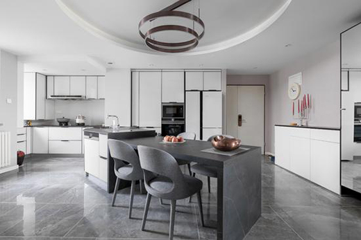 餐廳毗鄰客廳,同樣為異形空間,設(shè)計(jì)師順著原始結(jié)構(gòu)做相應(yīng)的規(guī)整造型,用島臺(tái)的位置來(lái)調(diào)整此空間。同時(shí)設(shè)計(jì)師用黑白灰為主色調(diào)用視覺(jué)去呈現(xiàn)一個(gè)協(xié)調(diào)的開(kāi)放式廚房,獨(dú)具匠心地展現(xiàn)出現(xiàn)代簡(jiǎn)約風(fēng)格,給人強(qiáng)烈的視覺(jué)沖擊。