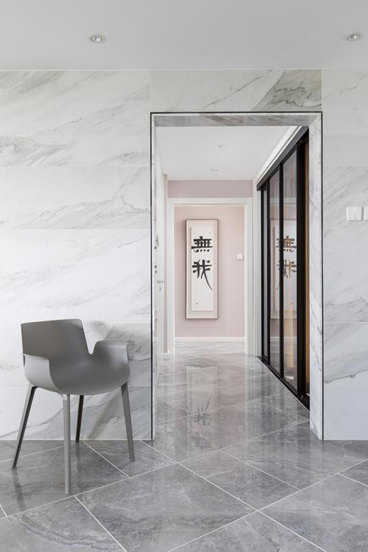 淡色墻體與灰色瓷磚相呼應(yīng),極大地提升了室內(nèi)的通透感,給人寬敞明亮的感覺(jué)。細(xì)看每片瓷磚的尺寸大小不一,錯(cuò)落有致,富有節(jié)奏感,時(shí)尚而協(xié)調(diào)。從燈具到家具,設(shè)計(jì)師巧妙地都選擇了方形,極具古典中庸之感,古色古香,寧?kù)o愜意。在其間煮茶品酒,亦可成為喧囂都市中的高尚隱士。