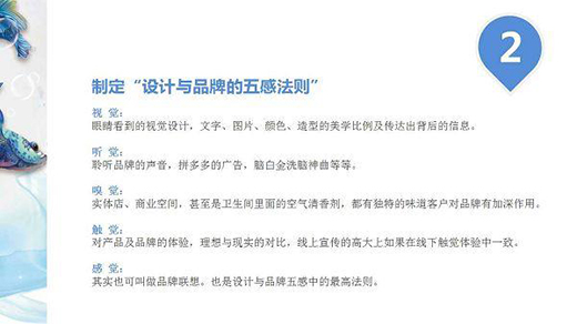提高自身品牌形象的另一種手段是制定設(shè)計與品牌的五感法則。具體包括視覺、聽覺、嗅覺、觸覺,感覺。
