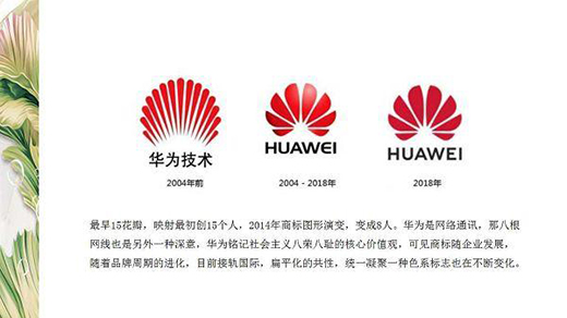 首先我們說下華為。2004以前華為的logo,有15花瓣,映射的是15個最初創(chuàng)創(chuàng)始人,2014年華為創(chuàng)始人變成了8個人,商標也演變成了8個花瓣,華為是做網(wǎng)絡(luò)通訊的,而網(wǎng)線里面也是8根小線,我想這也是有一定的意義的,也代表著華為銘記社會主義的八榮八恥價值觀等等。我們看華為的花瓣,從它的大小比例,從它的字體顏色,我們可以發(fā)現(xiàn),它也是隨著時代發(fā)展而發(fā)展,通過一個簡單的logo,去映射他們的品牌核心理念,第一個logo又大又密。第二個8瓣,美學(xué)的比例相對比較黃金,第三個與國際接軌,顏色更加扁平化,統(tǒng)一聚焦一個信息。