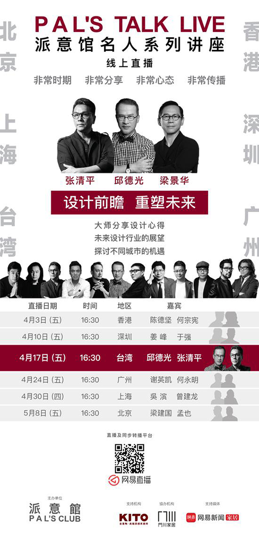 4月17日(周五)16:30,2020年派意館名人系列講座第三期(臺灣站)分享再繼續(xù),梁景華先生將攜手邱德光先生、張清平先生,將給大家?guī)硪粓鲇腥の队幸饬x的直播分享,一同探索室內(nèi)設(shè)計的無限可能。