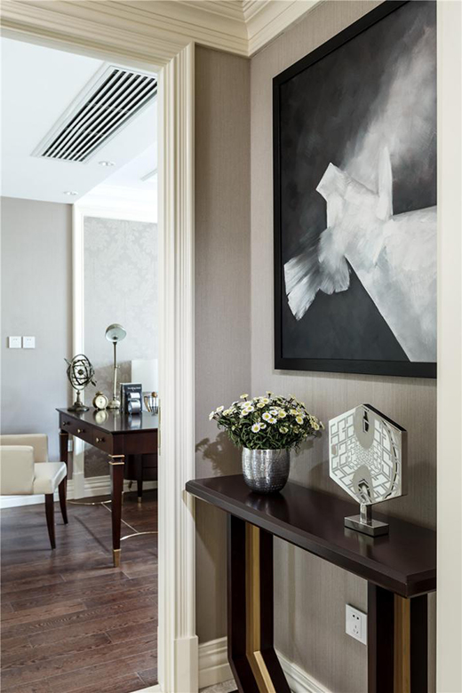 走廊上擺放著雛菊,馥郁的氣息彌漫在空氣中,旁邊是獨(dú)特而有現(xiàn)代感的金屬擺件,墻上掛著現(xiàn)代抽象的藝術(shù)畫(huà),行走其間,一點(diǎn)也不拘束。