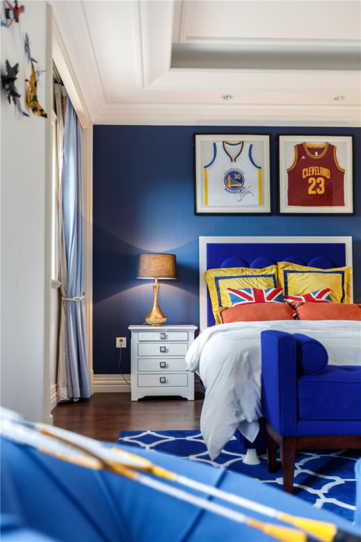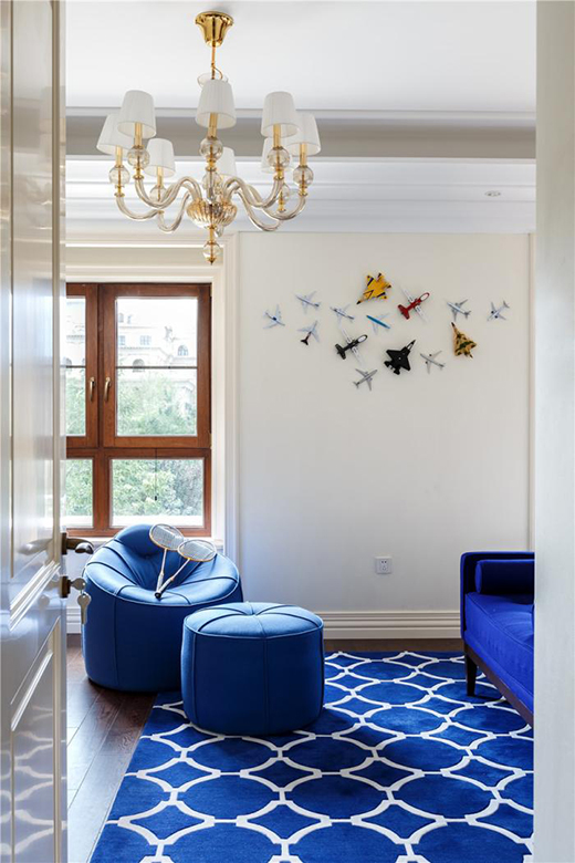 兒童房是孩子的理想樂(lè)園,由充滿(mǎn)活力、濃郁的藍(lán)色與白色組合而成,墻壁上是設(shè)計(jì)師精心整理組合的,男孩喜歡的飛機(jī)模型和喬丹衣服的簽名照,形成了獨(dú)特的風(fēng)景,干凈利落,動(dòng)感十足。