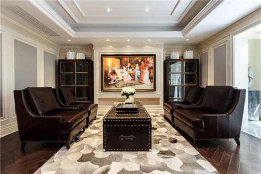 娛樂(lè)室位于地下一層,是主人接待朋友的地方,設(shè)計(jì)師采用法式家具慣用的結(jié)構(gòu)粗厚的木質(zhì)家具,搭配業(yè)主珍藏的西方宮廷油畫(huà),彰顯出主人對(duì)西方藝術(shù)的品味。