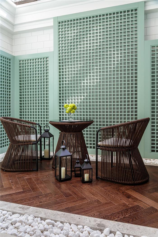 以青綠色為背景的陽(yáng)臺(tái),背景墻格柵若隱若現(xiàn),用線(xiàn)條組成的木質(zhì)藤椅,搭配著白色的鵝卵石,整個(gè)畫(huà)面洋溢著濃厚的藝術(shù)氣息,使人們仿佛置身于春天的景色之中,感受到永恒的新生。