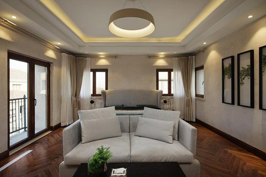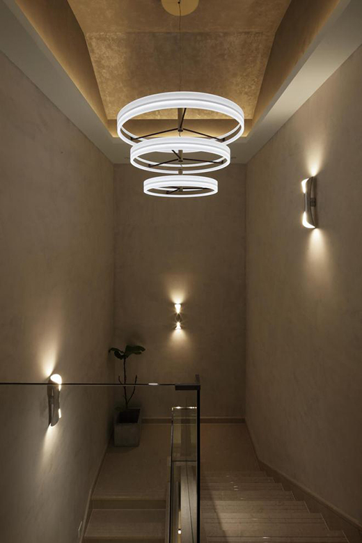 空間質(zhì)感的塑造除了材料與色彩的搭配,燈光的配合往往更能夠改變氛圍感。設(shè)計師李中偉便選擇在燈光設(shè)計上做點文章,“其實別墅最大的硬傷是層高,這個我們沒辦法改變,所以我考慮使用無主燈的方式,對于大平層和別墅而言,有些空間里,會選用見光不見燈的方式,而空間中燈光的塑造,還是需要考慮人的主體位置?!?/p>