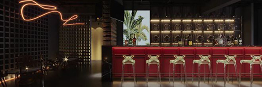 八只鸚鵡的名字靈感源自非洲的大型鸚鵡,所以大廳氛圍向往的是非洲原始的熱情和自然景觀。吧臺這一抹熱情似火的紅色,直接點燃了現(xiàn)場氣氛。