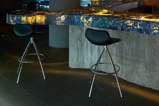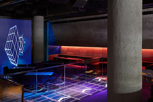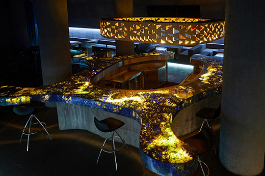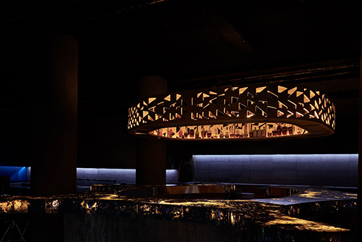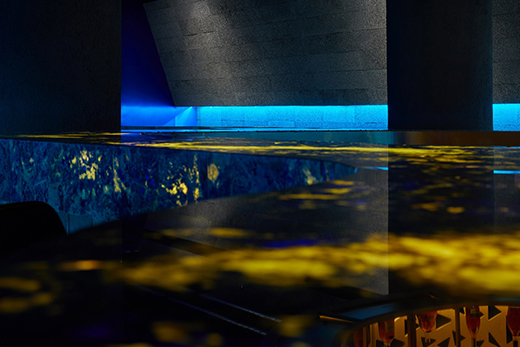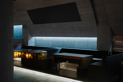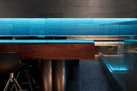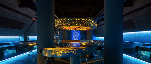 最后采用了泡沫鋁板的未來感和巖石質(zhì)感,與抽象的原始感吻合。藍(lán)色的氧化鋁板來源于湖水的意象,它具有一種神秘的光澤感。地面采用的火山巖片石,與洞穴相關(guān)聯(lián)。玻利維亞藍(lán)透光石如龍王的寶石,透著神秘的光芒。手工脫膜的混凝土吧臺(tái)基座帶出幾分力量與原始感,這與玻利維亞藍(lán)寶石般的光芒相得益彰??照{(diào)在洞穴兩側(cè)傾斜的壁面里,兩側(cè)燈光集中在傾斜的巖壁低處。中心部位的燈光以突顯龍王的桂冠和LED屏的光影。