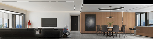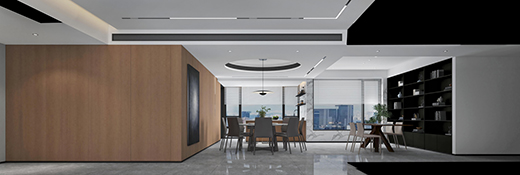為了使室內(nèi)看起來更具舒適性,設(shè)計師使用了嚴格的幾何輪廓與黑白對比,同時增加了自然木色,結(jié)合細致的燈光設(shè)計,用光線的布局變化來營造室內(nèi)氛圍。