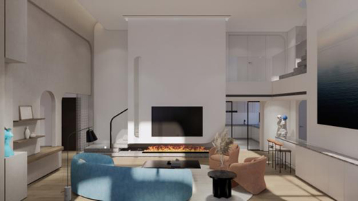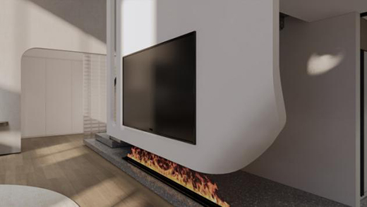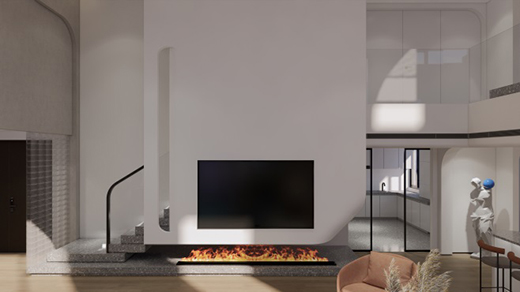 客廳大膽地通過一系列“大塊面的白”來演繹白色系的優(yōu)雅大氣,通過鋪設(shè)淺色木地板,搭配莫蘭迪色系絨布質(zhì)沙發(fā),空間透著淡淡的溫柔。懸空的巨型電視背景墻,從天花直墜而下,右下角模仿著翹起的書頁造型,像是被下方電子霧化壁爐燒到翹起的書角,可愛又靈動。