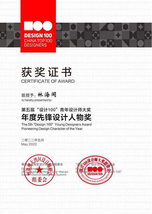 在“設計之都”這個舞臺上,著名設計師、深圳市禾田設計工程有限公司(禾田營造)創(chuàng)始人林海聞憑借多年設計經(jīng)驗及高水平領導能力,榮獲““設計100·年度先鋒人物”稱號。