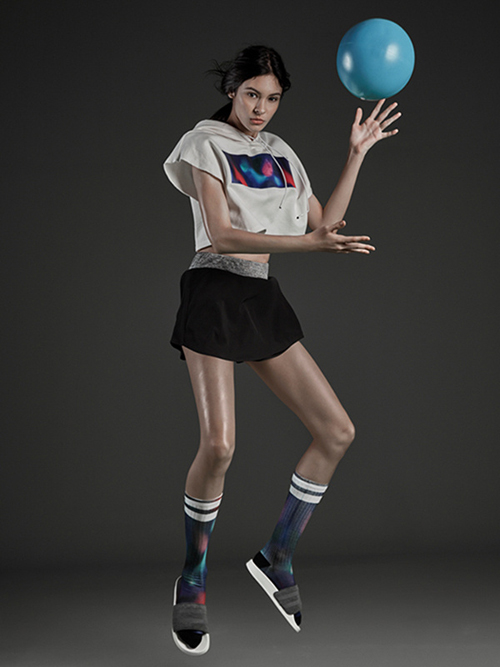 運(yùn)動(dòng)時(shí)身體會(huì)產(chǎn)生大量的熱氣和濕氣,運(yùn)動(dòng)類時(shí)裝必須以能及時(shí)排除身體的熱氣和濕氣來保證人體的生理舒適需求。UR設(shè)計(jì)師巧妙運(yùn)用純棉棉料吸汗、透氣這一特點(diǎn),對(duì)圖案、色調(diào)、剪裁甚至廓形進(jìn)行了絕妙創(chuàng)意,印花工字T、交叉織帶文胸、箱型截短印花上衣等單品讓本季的“運(yùn)動(dòng)范”格外耀眼,用簡(jiǎn)單的創(chuàng)意打造出新一代“輕奢”風(fēng)范。