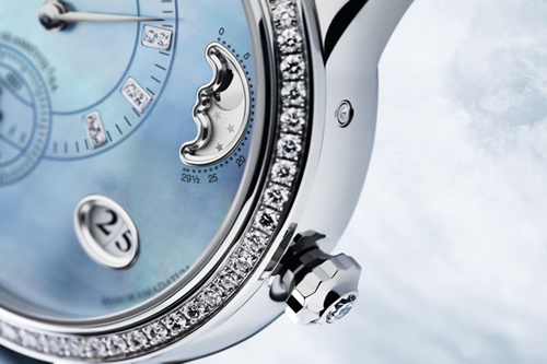 PanoMatic Luna 偏心月相女士腕表的最新款式為高級(jí)制表藝術(shù)呈現(xiàn)了不折不扣的極致天空美景:淡藍(lán)色的珍珠母貝表盤(pán)上一彎銀色明月當(dāng)空高掛,還有顆顆鉆石宛若星光璀璨。特有的偏心小時(shí)/分鐘顯示、小秒針以及Glashütte Original 格拉蘇蒂原創(chuàng)經(jīng)典的大日歷都使人在讀取時(shí)間時(shí)感到別有一番樂(lè)趣。