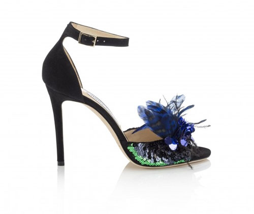 金色及紫紅色閃爍的層層彩虹亮片,仿如閃閃發(fā)光的羽毛,在KLARA和KIMROV鞋款中包裹著足部和腳踝。KLARA是一款露趾平底涼鞋,擁有透明或?qū)嵣孽讕АIMROV采用鏡面皮嵌邊,與絨面山羊皮的鞋身形成對比,而踝帶沿用了羽狀設計。