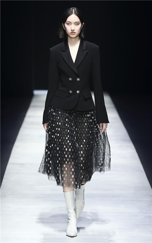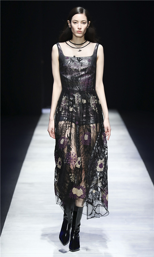 及至繁星掛上夜幕,無垠星河閃爍成一個(gè)浪漫靜謐的夜晚。閃光金屬感和解構(gòu)式剪裁在高級(jí)精致的女性化風(fēng)貌中加入了絲絲未來的氣息。如夜空靜謐的黑與浪漫藍(lán)中,閃光材質(zhì)耀熠著斑斕五彩的星光,通透的網(wǎng)紗、歐根紗和星云色條共同搭建起一片幻美而真實(shí)的世界。鑲嵌有鉆鏈、手工刺繡、羽毛等高定細(xì)節(jié)的優(yōu)雅小禮服搖曳出穿梭于過去與未來、現(xiàn)實(shí)與超現(xiàn)實(shí)之間的精彩新女性生活。