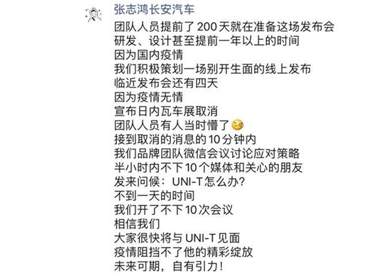 車展會取消,但豪車不會缺席。短短的幾天時間,一場工作量不亞于線下的發(fā)布會活動——長安汽車UNI-T全球亮相線上直播發(fā)布會在3月5號(驚蟄)如期舉行。正如宣傳中所說,疫情無情,但阻攔不了UNI-T的精彩綻放,這也是所有長安人的斗志以及激情的綻放。