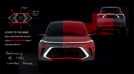 前臉,上方鍍鉻線條自然延伸至LED燈組,造型像極了一個飛翔的翅膀,代表著未來建筑風(fēng)格,下方則是六邊形進氣格柵,二者成為一個整體,寓意“飛翔的開放空間”。這種中國文化與國際領(lǐng)先設(shè)計理念的融合,配合兩側(cè)造型犀利的進氣口造型,令新車看上去更加自信大氣。