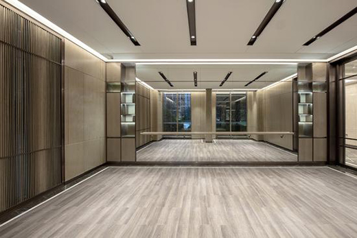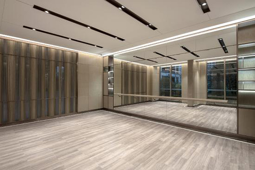 在傳統(tǒng)設(shè)計的基礎(chǔ)上做了獨特的差異化處理。按以往經(jīng)驗看,瑜伽房需要開闊空間,不能添加阻礙人員活動的冗余裝飾,并且大部分墻面需要為練功鏡預留位置,本身留給設(shè)計師的發(fā)揮空間并不多。