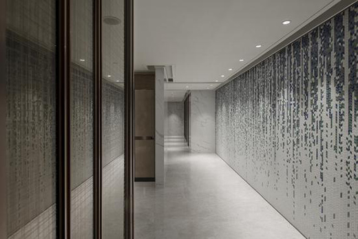 為增添幾凈雅致的氛圍,接待臺選用黑白根大理石,與背景墻共同構(gòu)成了和諧統(tǒng)一又對比強烈的視覺主體。背景墻兩邊以屏風延伸,運用夾絲玻璃編織出細膩的紋絡(luò),最外側(cè)點綴現(xiàn)代風格的藝術(shù)品,簡明精巧又不顯刻意地再次抬升了整體空間的格調(diào)。