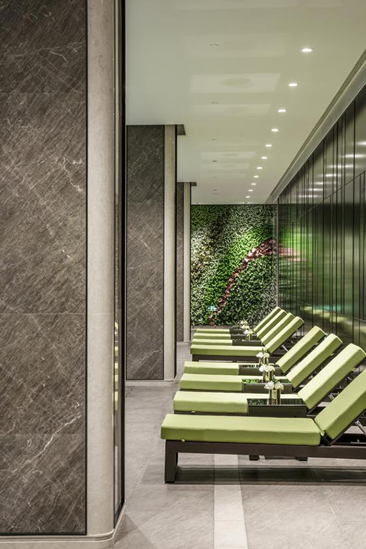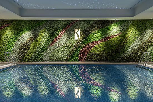 每一處細節(jié)的悉心考究,模糊了室內(nèi)外的界限。泳池盡頭是一整片植物墻,淺青、深綠、紅棕……不同植物構(gòu)成一條條斑斕的色帶,層次分明又渾然一體,不僅具備強烈的視覺沖擊感,也渲染出了十足的自然氣息。