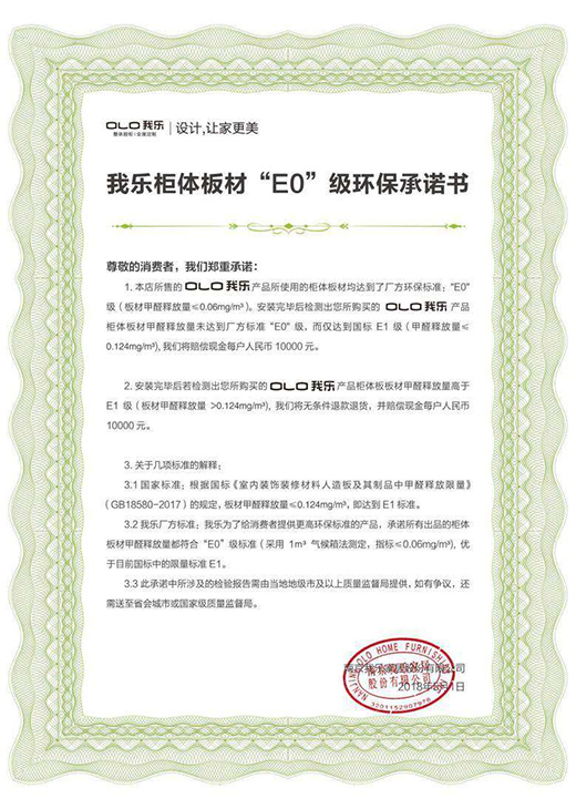 我樂(lè)櫥柜的板材一貫沿用E0級(jí)標(biāo)準(zhǔn)環(huán)保板材,其甲醛釋放量≤0.06mg/m3,遠(yuǎn)優(yōu)于國(guó)家規(guī)定標(biāo)準(zhǔn)的E1級(jí)板材(甲醛釋放量≤0.124mg/m3)。而且,為讓用戶用得更安心和放心,我樂(lè)還會(huì)為購(gòu)買者提供《我樂(lè)柜體板材“E0”級(jí)環(huán)保承諾書》,給予用戶多重保障。