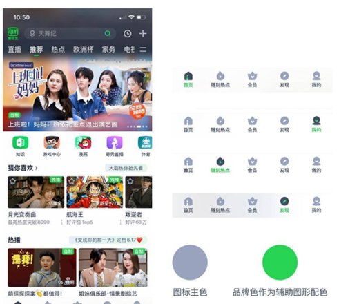 在配色上,輔助圖形還可以結(jié)合品牌色彩。嘗試加入以品牌色裝飾元素作為點綴,立馬就能提升圖標細節(jié)。下面這個案例是愛奇藝的首頁圖標設計,能看出來它的輔助圖形設計配色上是按品牌綠色來設計的。品牌色的加入,能夠讓圖標配色的使用找到立足的理由。
