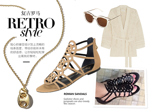 裸色系的開衫是換季時節(jié)當仁不讓的人氣之星,怎么搭都會有自成一派的風格。偏愛大氣的女孩不如戴上復古味十足的棕色墨鏡和金色飾鏈,讓每一處都不平凡!當然,最矚目的仍然是腳下那一雙復古羅馬鞋,鏤刻著獨一無二的張揚個性。