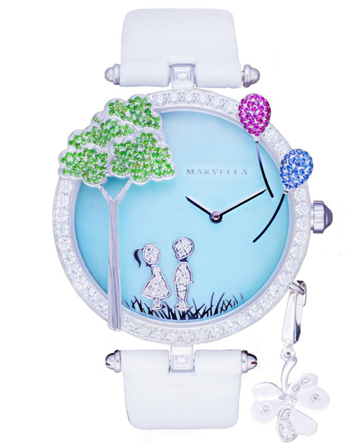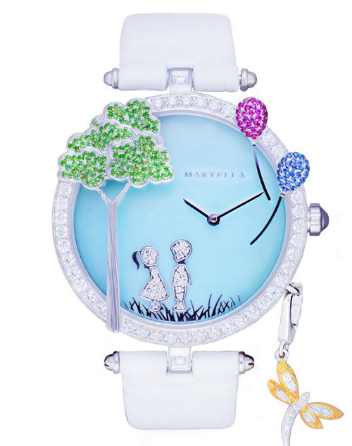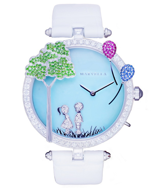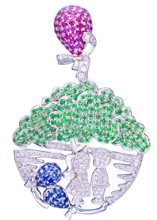 St Paul de Vence系列珠寶刻畫了一對在山坡上放飛氣球的小情侶甜蜜歡快的景象。氣球鑲嵌著紅、藍寶石,小情侶相視而立于由沙弗萊寶石塑造出來的翠綠樹蔭下互訴衷腸。