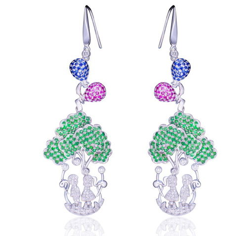 St Paul de Vence系列珠寶刻畫了一對在山坡上放飛氣球的小情侶甜蜜歡快的景象。氣球鑲嵌著紅、藍寶石,小情侶相視而立于由沙弗萊寶石塑造出來的翠綠樹蔭下互訴衷腸。耀眼的紅藍寶石和沙弗萊寶石的組合,顏色絢麗繽紛令人愉悅;以鉆石勾勒的一對小情侶靈動俏皮,細膩地描繪了一副純潔浪漫的景象。