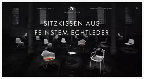 Hillman Living 的首頁采用了一張看起來略顯荒涼單調(diào)的圖片來營造冷峻的氛圍,同時用顯眼的暖色調(diào)來點(diǎn)綴,與整體的氛圍構(gòu)成對比,緊緊抓住用戶的注意力,讓用戶注意到圖中獨(dú)特的椅子。