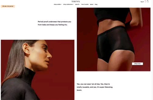 Thinx這個(gè)案例我非常喜歡,并且經(jīng)常會(huì)用到,因?yàn)樗C明了設(shè)計(jì)師并不一定非得靠高飽和度的霓虹色來(lái)創(chuàng)造高對(duì)比度的配色。即使是兩種平衡的顏色,也能讓整個(gè)設(shè)計(jì)脫穎而出。