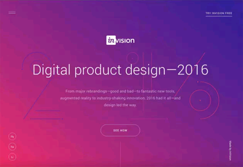 除開(kāi)其他的目的,設(shè)計(jì)師使用色彩或者調(diào)整色彩的目的,基本都是為了創(chuàng)造設(shè)計(jì)的一致性。InVision的年度總結(jié)頁(yè)面使用了從粉色到紫色的漸變,在頁(yè)面的下方,粉色和紫色同樣應(yīng)用到了按鈕中,此外,在著陸頁(yè)當(dāng)中,將對(duì)比度明顯的白色置于粉色+紫色的背景之上,確保信息的清晰呈現(xiàn)。如果色彩每次都不一樣,那么整個(gè)設(shè)計(jì)看起來(lái)就不是那么令人難忘了。
