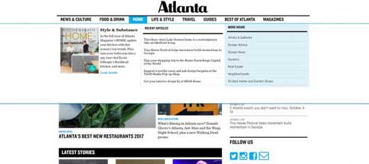 Atlanta Magazine 的大型導(dǎo)航菜單給人的體驗(yàn)就非常流暢,下拉菜單中嵌入了大量的鏈接。由于響應(yīng)式的滑動(dòng)導(dǎo)航在移動(dòng)端上也已經(jīng)很常見了,這使得它還輕松兼顧到了移動(dòng)端的設(shè)計(jì)。