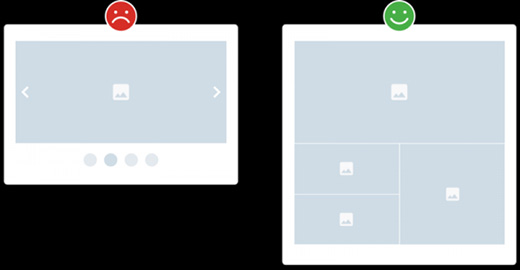 他們真的不是。從表面上看,它們似乎是一種將交互性添加到頁面上同時又節(jié)省空間的聰明方法,但它們的點擊率低得令人尷尬。一項大型研究顯示,只有1%的用戶在演示幻燈片時與幻燈片交互,而大多數(shù)用戶只在第一張幻燈片中這樣做。此外,一些眼動跟蹤測試顯示,用戶經(jīng)常跳過幻燈片中的內(nèi)容。