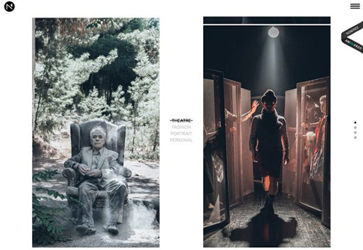Nikos Pandazaras 的作品集網(wǎng)站則選擇了截然不同的設(shè)計(jì)思路。他將導(dǎo)航置于屏幕的中間,而攝影作品則左右各一并排放置,兩者的重要性無(wú)疑是對(duì)等的,用戶可以同時(shí)看到兩幅不同的作品,屏幕的利用率倒是挺高的。