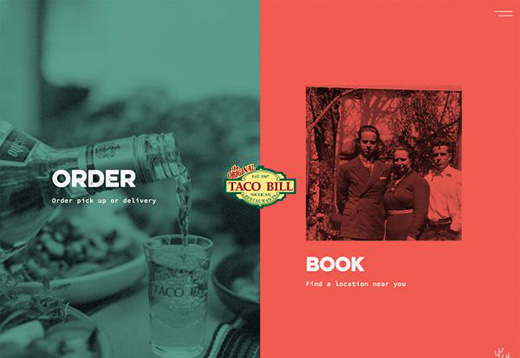 Taco Bill 的網(wǎng)站就是一個(gè)很好的例子,當(dāng)你打開(kāi)網(wǎng)站的時(shí)候,設(shè)計(jì)師就為用戶提出了兩個(gè)問(wèn)題:你是想打包帶走事物,還是預(yù)訂之后在餐廳里吃?通過(guò)分屏的方式,用戶有了兩個(gè)不同的選擇。分屏式的設(shè)計(jì)讓用戶的選擇更加直觀、可視化。