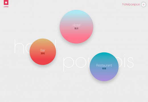 Hotel Poispois 這個(gè)頁(yè)面則使用浮動(dòng)的圓形來(lái)提升視覺(jué),它們也可以被視作為巨大的按鈕,將用戶導(dǎo)向不同的頁(yè)面。