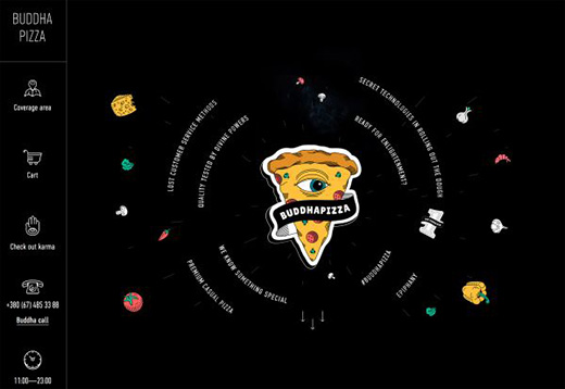 Buddha Pizza 這個(gè)頁(yè)面則讓文字構(gòu)成圓環(huán),圍繞這批薩,創(chuàng)造出獨(dú)特的視覺(jué)奇觀。